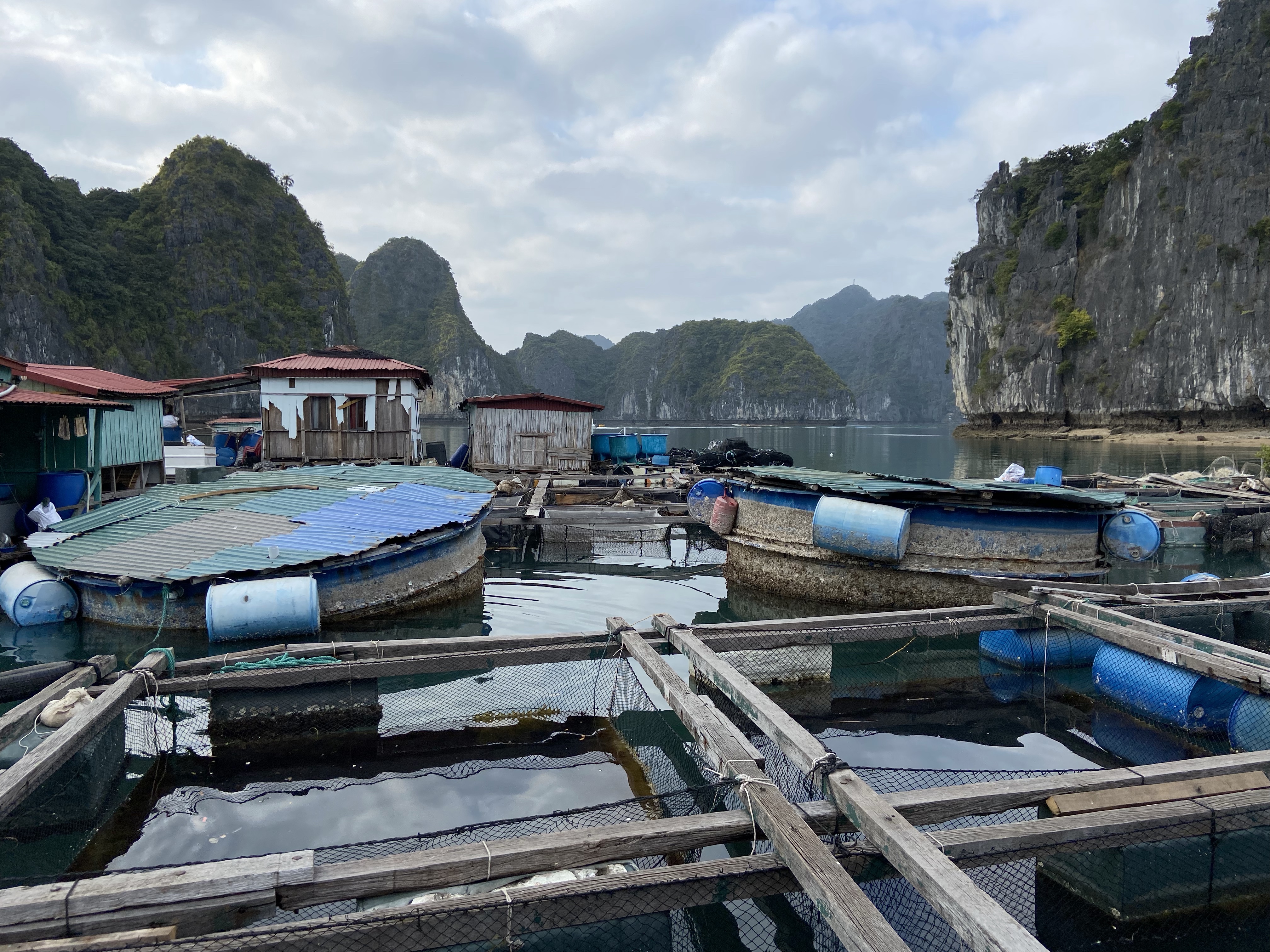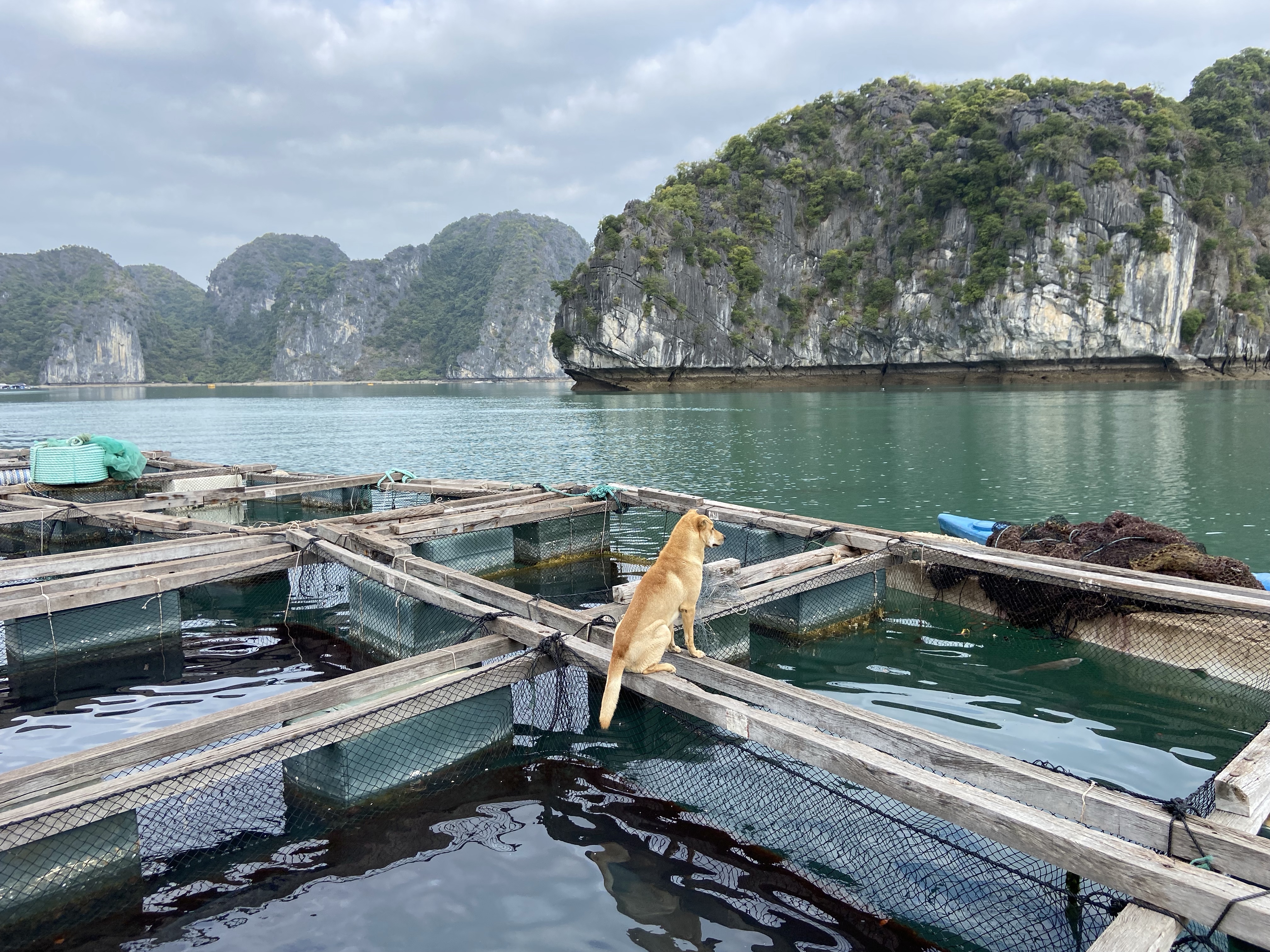 Three wooden houses built upon blue barrels floating in Lan Ha Bay. In front of each house is a fish farm built from wood with nets into the sea. On the closest house is a dog guarding its territory. Behind the houses there are the famous limestone cliffs which rise up from the water.
