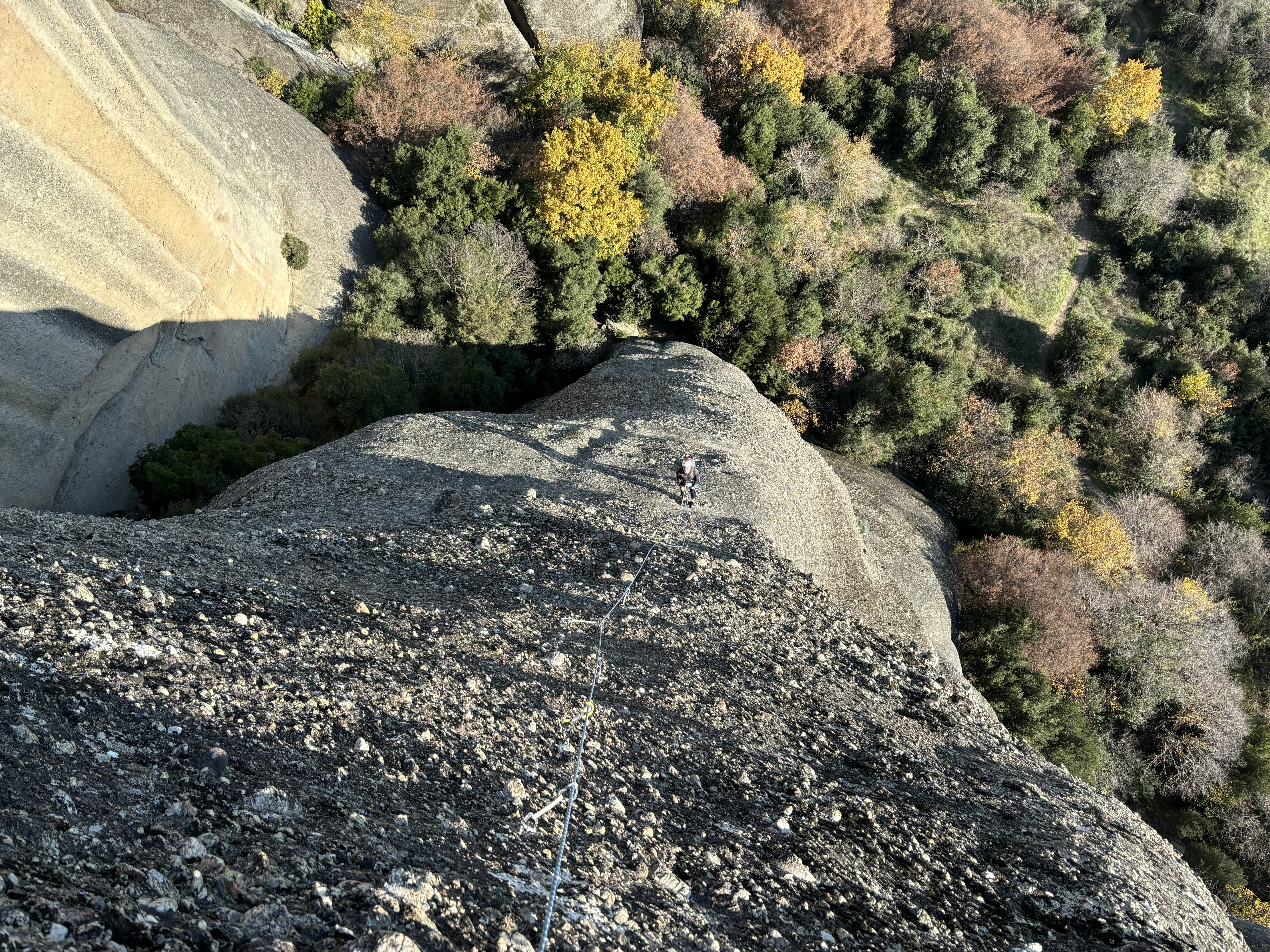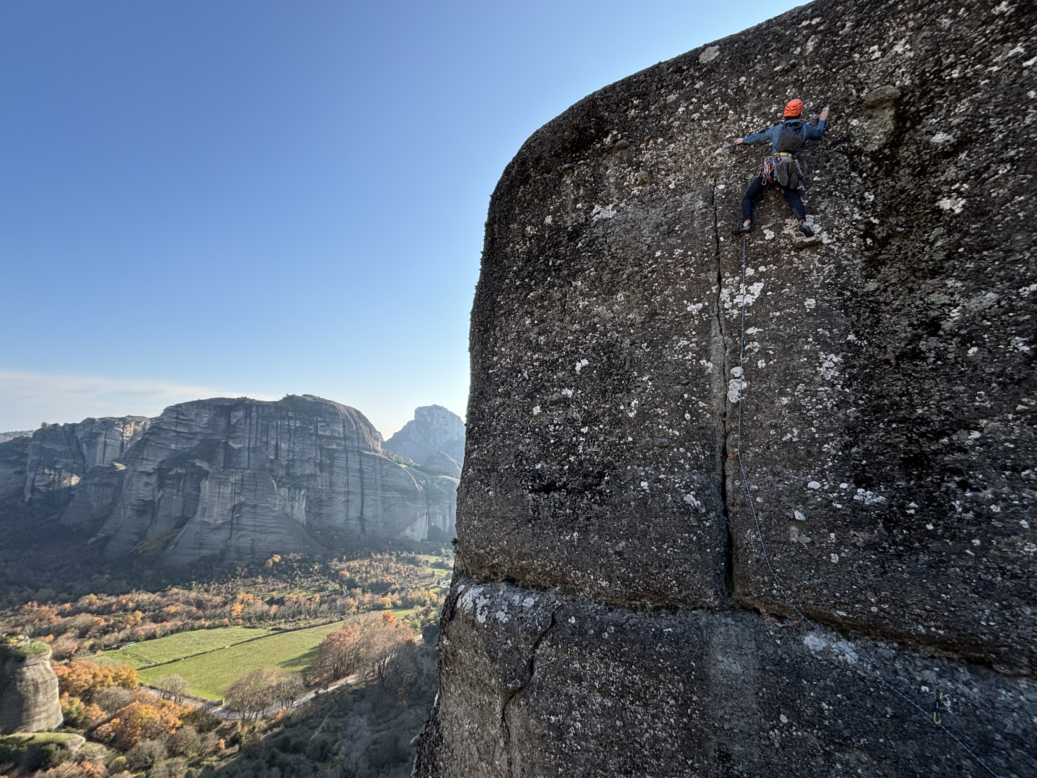 The conglomerate rock of Meteora is pretty straightforward to climb on. The main variation comes from either the steepness or the size of the pebbles. The easier classic routes are off vertical and usually on cobbles somewhere between the size of an egg and a large potato. There are harder routes too, which are typically steeper and on smaller holds – but with closer bolts! Whilst the conglomerate has formed so many beautiful summits, to be truthful it isn’t the best quality of conglomerate. We encountered several loose pebbles even on popular routes, and also broke a few off that seemed solid. Normally this wouldn’t be a big deal but you must be extra careful in Meteora, as 10 meter runouts are not uncommon, some are longer! If you’re an experienced climber, it’s hard to imagine falling off any of the classic routes, due to the straightforward nature of the moves – so paying extra attention to the solidity of the cobbles is the best way to avoid logging some unwanted air time.